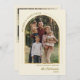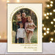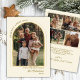 Elegante Tarjeta de Navidad Feliz de Navidad para el Arco de Oro 5 Fotografías de Temporada. Celebre la temporada con estilo con esta elegante tarjeta de Navidades de fotografía familiar con un moderno marco fotográfico en forma de arco de color dorado. Personalízalo con tus fotos familiares favoritas, el nombre de la familia y el año con un fondo blanco o beige crema neutro. El diseño minimalista festivo se resalta con la elegante tipografía de la temporada de saludos de color falso dorado, creando un ambiente cálido y atemporal. La parte posterior muestra 4 collage de fotos con borde dorado y plantilla de mensajes de vacaciones con nombres con letras a mano. Una tarjeta de vacaciones perfecta para compartir con la familia y los amigos en temporada de vacaciones de invierno.
