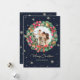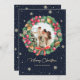Elegante tarjeta de Navidades fotográficos azules con una foto dentro de una corona acuarela de bayas, hoyos, conos de pino, ramas de árboles de coníferas y flores de poinsettia sobre un fondo azul oscuro con un título de letra de guión con letras de oro, copos de nieve y caída de nieve. Personaliza fácilmente esta tarjeta de Navidades de fotos de acuarela con tu imagen, un nombre de familia y un texto. Los colores de fondo se pueden cambiar a cualquier color.