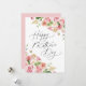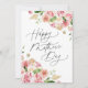 Elegante, floral tarjeta del día de la Madre con peonías de acuarela rosada, rosas, dahlias e hidrangeas con hojas verdes vibrantes en las esquinas del diseño. "Feliz Día de la Madre" se muestra en el frente en caligrafía moderna. La parte posterior de la tarjeta rosa peony del Día de la Madre muestra tu foto y tu mensaje escrito a mano o con tipeo con un fondo rosa rubor.