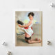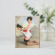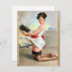 Elvgren Pin Up Chica Art. Una mujer vestida con un delantal blanco y tacones rojos se arrodilla en una cocina, sosteniendo una bandeja de comida quemada con humo saliendo. Su expresión sugiere sorpresa mientras mira por encima de su hombro.