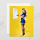Elvgren Pin Up Chica Art. Una mujer vestida con un traje de camarera de estilo retro sostiene una bandeja con una taza de vapor y una repostería, todo ello con un fondo amarillo brillante. Su atuendo incluye un vestido azul, medias y un pequeño delantal blanco, que representa una estética vintage.