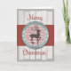 Saludo de vacaciones de bonito con emblema redondo de reno y copos de nieve a lo largo de una bandera roja oxidada que corre el ancho de la carta. Las vallas blancas rusticas ilustradas iluminan el fondo. Una manera encantadora de desearle a su enfermera una Feliz Navidad.