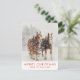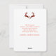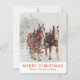Una tarjeta de vacaciones de estilo plano con una fotografía de dos caballos de tiro belgas tirando de un trineo. Copos de nieve cayendo suavemente con pinos cubiertos de nieve en el fondo. En el reverso de la tarjeta hay un ilustracion de 2 ciervos saltantes con colorido rojo sobre tu mensaje personalizado.