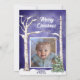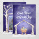 Todo el texto de esta tarjeta se puede editar. La parte delantera tiene una escena de pesebre y un saludo simple. "Buenas Noticias de Gran Alegría" pero puedes cambiar el texto si lo deseas. La parte trasera tiene espacio para tu propia foto, enmarcada por abedules, un pequeño árbol de Navidad y una cadena de luces de Navidad.