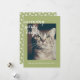 Tarjeta de Navidad con tema de gato festivo con el texto "espíritus maullando brillantes" en elegante caligrafía y tus deseos de vacaciones en tipografía moderna y elegante. Simplemente agrega tu texto y sube tu foto favorita de tu gato. La parte trasera de la tarjeta tiene un patrón de copos de nieve sobre un fondo verde. Diseñado exclusivamente para ti por Happy Dolphin Studio. Si necesitas ayuda o productos relacionados, por favor contáctanos en happydolphinstudio@outlook.com.