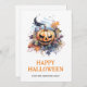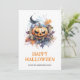 Tarjeta acuarela de Halloween con calabaza espeluznante y coloridas hojas de otoño. Personalice fácilmente esta tarjeta personalizado de Halloween con su nombre y texto familiar.