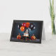 Esta tarjeta captura un tema de cumpleaños de Halloween caprichoso y espeluznante. En el centro hay un personaje de aspecto siniestro con una cara esquelética y cabello negro despeinado, asomándose detrás de un pastel de cumpleaños. El pastel está decorado con gotas de glaseado negro y maíz de caramelo colorido, lo que añade a la atmósfera festiva. Alrededor del personaje hay globos negros y naranjas, lo que realza la vibra de Halloween.