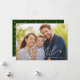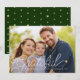 Tarjeta de vacaciones de foto simple y moderna con la leyenda Agradecida en caligrafía estilizada y circular, con tu nombre, deseos y año abajo. En el reverso se imprimen puntos dorados y estrellas sobre un verde oscuro navideño.