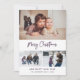 Cartas de fotos de la personalizado morada Feliz Navidad con tres fotos con un título con letras a mano en el frente y fondo morado con caída de nieve y estrellas en la parte de atrás. Personaliza fácilmente estas tarjetas de foto navideñas con guiones morados con tus imágenes, un nombre familiar y el año.