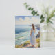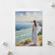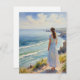 Una mujer sobre un acantilado, mirando hacia el océano expansivo bajo un cielo brillante. La escena capta un momento de paz cuando las olas se dirigen suavemente hacia la orilla rocosa.