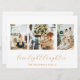 Celebra la temporada con esta moderna tarjeta de vacaciones de tres fotos que incluye a tus recuerdos favoritos de la familia y la frase "love.light.laughter" en elegante escritura de oro. Diseñada con un diseño minimalista y un tono emocional suave, esta tarjeta pone tus fotos en el corazón del mensaje mientras que ofrece un cálido y tranquilo saludo de temporada. La parte posterior de la tarjeta incluye este mensaje sincero: Que la luz de las vacaciones ilumine tu casa con calor y felicidad. Personaliza con tu nombre, mensaje y fotos para crear un toque de alegría que se sienta moderno, significativo y lleno de alegría. Disponible en formato impreso, como descarga digital o ambos