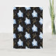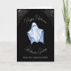 Fantasma de sábana blanca sobre un fondo negro con telarañas que decoran las esquinas superiores de la tarjeta de felicitación. El diseño en el reverso de la tarjeta presenta una candelabra y telarañas espeluznantes en las esquinas superiores.