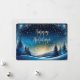Elegante tarjeta de vacaciones azul y dorada, que muestra una escena navideña pintoresca que irradia el espíritu de alegría. ¡Perfecta para difundir alegría y buen ánimo durante la temporada navideña!