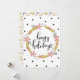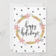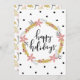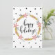 Esta tarjeta de fiestas moderna y festiva es una excelente manera de mantenerse en contacto durante esta temporada festiva. Este diseño simple presenta una corona floral con el texto "felices fiestas" en un lado. En el otro lado hay un patrón de acebo con un espacio en blanco enmarcado para escribir tu propio mensaje.