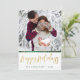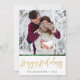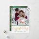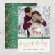 Envía a alguien felices fiestas con esta tarjeta única. La parte frontal tiene un espacio para que agregues tu nombre y el año, y para agregar tu propia foto. Felices Fiestas está escrito en una fuente de letra dibujada a mano y cubierta con una textura de lámina dorada. La parte trasera tiene una hermosa textura de lámina dorada y un patrón profundo verde dibujado a mano con espirales, puntos y flores.