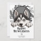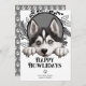 Feliz Día de Amanecer Tarjeta navideña de Navidades de perro del Mascota Husky Husky Siberian de Ricaso - diseñada con una maravillosa tipografía Happy Howlidays text to front - una divertida tarjeta de vacaciones con temática de perro, tu peludo miembro de la familia merece enviar sus propios saludos de vacaciones .. fácil de agregar tu propio texto y foto - con un divertido y audaz patrón de huella de pata a la parte trasera diseñada en blanco y negro