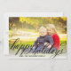 La tarjeta de foto estacional incluye un diseño de sobreimpresión de escritura caligráfica manuscrita negra "Happy Holidays" con un texto serif moderno y personalizado que puede ser personalizado con el año y su familia / nombre. La parte posterior de la tarjeta incluye rayas horizontales blancas abstractas con un fondo de color negro.