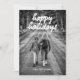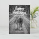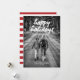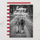 Tarjeta de fotos de feliz feriado con las palabras "felices feriados", en blanco, en negrita, superposición de tipos de letra, y plantilla de imagen en blanco y negro con dos chicas caminando. La parte trasera de estas tarjetas de Navidades de fotografía planas 2014, 5x7, presenta un patrón festivo de franjas horizontales rojas y blancas.