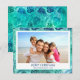 Relieve metalizado Faux azul y verde turquesa incandescente Feliz Navidad Tropical Palm Tropical Navidades Fotos de Navidad en Hawái. La foto y el nombre de la familia pueden ser reemplazados en esta simple tarjeta fotográfica de la familia de Navidades de la playa o de la costa.