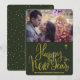 Tipografía contemporánea moderna elegante dorada y verde cazador oscuro Feliz Año Nuevo tarjeta de felicitación con una foto familiar personalizada orientada horizontalmente en el lado frontal y patrón de confeti dorado en la parte posterior. ¡Personalízalo con tu firma! -------- Tenga en cuenta que el color de fondo es editable. Para cambiarlo, seleccione la opción adicional PERSONALIZAR.