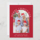 Tarjeta navideña estacional de Navidades rojos con fotos mostradas en un marco de arco, "Feliz Navidad" en la típica tipografía serif blanca, y tu nombre y un saludo estacional con letras blancas simples. El reverso muestra un año en revisión de un collage de fotos de sus personas favoritas y momentos del año pasado.