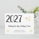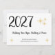 Feliz año nuevo 2021, con tipografía de escritura negra en fondo blanco. Con grabado de personalizable, puede añadir su propio mensaje. Un patrón dorado de copos de nieve acentúa la parte delantera de la tarjeta y cubre el fondo negro de la parte posterior. Una gran manera de enviar sus deseos de recuperación de la esperanza y paz en el nuevo año.