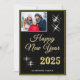Tarjeta de vacaciones moderna y elegante de Feliz Año Nuevo 2025 con Foto y Brillos Elegantes en negro y dorado. Brillos blancos sobre fondo negro y en una tipografía trendy. Agrega tu foto en la parte frontal y tus deseos en la parte trasera.