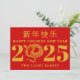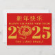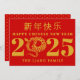 Tipografía dorada en negrita Tarjeta de Feliz Año Nuevo Chino de la serpiente. Esta tarjeta de felicitación celebra el Año Nuevo Chino de la Serpiente con una llamativa tipografía en negrita. Muestra la felicitación "Feliz Año Nuevo" tanto en chino simplificado como en inglés, con el año 2025, donde una serpiente reemplaza creativamente al cero, todo bellamente mostrado en dorado sobre un vibrante fondo rojo. La parte trasera de la tarjeta está adornada con un cautivador patrón de diamantes dorados sobre el mismo rojo, lo que añade a su encanto opulento y la convierte en un saludo festivo ideal.