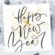 Tarjeta Festiva Feliz Año Nuevo con texto escrito a mano en gris