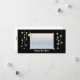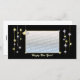 Tarjeta negra con mi diseño de estrellas doradas y plateadas, campanas y gaviotas. El texto del personalizable dice "¡Feliz Año Nuevo!"