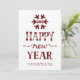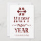 Tipografía elegante y ornamental de Feliz año nuevo en rojo y blanco, copo de nieve, pino y conos. ¡Use la herramienta Personalizar para agregar su texto, año de celebración, nombre de la familia!