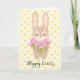 Un diseño lindo y lacónico sobre un delicado fondo azul con margaritas. Un lindo conejito de Pascua con un ramo de flores te ayudará a transmitir tus cálidos deseos a la abuela en las brillantes vacaciones de Pascua.