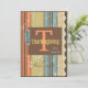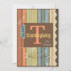 Tarjeta de Acción de Gracias a rayas. Una combinación de colores otoñales que incluye calabaza clara, azul gris, amarillo y marrón. Hay una bonita pestaña de carpeta azul en el borde del periódico que tiene una gran T y dice Acción de Gracias. Algunos rollos de color marrón oscuro bonito terminan con la tarjeta. La tarjeta es apropiada para amigos o familiares. Podría funcionar como una invitación a la cena de Acción de Gracias o una celebración de otoño. Los tonos cálidos y las franjas creativas hacen que esta carta única sea muy atractiva.