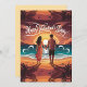 Una escena romántica se desarrolla mientras una pareja está de pie, mano a mano, en una soleada playa. La cámara barre suavemente desde una toma amplia, capturando la vibrante puesta de sol que proyecta tonos cálidos en el cielo y se refleja en las olas. Mientras miran hacia el horizonte, la cámara gira lentamente alrededor de ellos, mostrando el suave golpeteo de las olas y el suave susurro de las hojas de las palmeras. La atmósfera está llena de amor y tranquilidad, realzada por una paleta de colores pastel. La escena transita suavemente, evocando una sensación de calidez y conexión, perfecta para una celebración del Día de San Valentín.