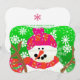 Carta de vacaciones colorida, luminosa, alegre y caprichosa, con un muñeco de nieve en un gorra de invierno y una bufanda de naranja rosa caliente y luminoso sobre un fondo verde brillante con muchos copos de nieve blancos bonitos. La parte posterior presenta un copo de nieve rosa con un área donde puede agregar su mensaje de texto y sus nombres. ¡Tenemos franqueo, pegatinas, etiquetas de dirección de retorno y sobres!