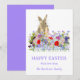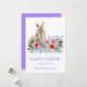Adorable acuarela conejo de Pascua y carta de saludos feliz de Pascua con espalda morada y tipografía. Hermosos florales de primavera boho incluyendo flores de maíz adorno de adormidera y flores de prado de jardín. Pintura moderna a mano en tonos azul, rojo, rosa, morado, verde y lavanda. Fácil de personalizar el guión moderno de tipografía de escritura a mano para que puedas añadir tu nombre de familia y saludos. Pintura original de la artista Catherine Sweetman