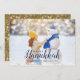 Personalizado económico imprimió tarjetas fotográficas de vacaciones con plantillas sencillas para la personalización. Este diseño moderno de moda tiene un purpurina falso y un elegante texto de caligrafía. El texto dice "Feliz Hanukkah". Personalízalo con tus fotos y agrega tu apellido y el año. El lado inverso tiene un fondo falso de purpurina dorado o usa el espacio para fotos y texto adicionales. Utilice las herramientas de diseño para editar el texto, añadir más fotos y crear una única tarjeta de fotos de un tipo Hanukkah.
