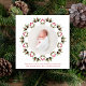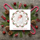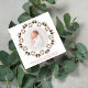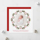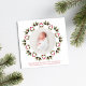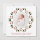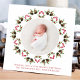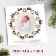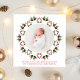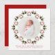 Este diseño presenta una alegre Navidad, una foto única, simple rojo y verde, tipografía linda, una corona minimalista clásica, un elegante follaje botánico, un verde hueco rojo, un rústico cono de pino de invierno, una mínima tarjeta fotográfica de vacaciones