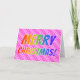 Este divertido diseño de tarjetas de felicitación para Navidades presenta el mensaje "MERRY CHRISTMAS!" que tiene letras con un coloreado patrón de gradiente de espectro de colores arcoiris. El fondo presenta un patrón de formas de corazón rosado a rayas.