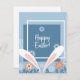 Fondo azul, marco blanco con hermosos oídos de conejito de Pascua, flores y follaje en el fondo, dice Feliz Pascua