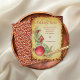 Personaliza el texto de esta tarjeta para incluir tu propio mensaje especial y un saludo con tu nombre. La tarjeta presenta una granada pintada con acuarela, flores y una rama frondosa sobre un fondo de papel quemado. La parte posterior de la tarjeta contiene un elegante patrón de damasco en tonos dorados sobre rojo intenso.