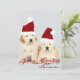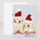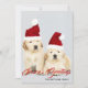 Este diseño navideño presenta una foto de dos cachorros de Golden Retriever que llevan sombreros rojos de Navidad y el texto "Saludos de la Temporada" escrito en tipografía roja popular con un nombre de familia añadido debajo. La parte posterior de la tarjeta tiene un dibujo animado de un reno festivo. Para personalizar, puede agregar su propia foto y editar el texto.