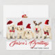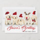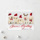 Este diseño navideño presenta una foto de dos cachorros de Golden Retriever que llevan sombreros rojos de Navidad y el texto "Saludos de la Temporada" escrito en tipografía roja popular con un nombre de familia añadido debajo. La parte posterior de la tarjeta tiene un dibujo animado de un reno festivo. Para personalizar, puede agregar su propia foto y editar el texto.