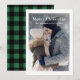 Esta sencilla y rústica tarjeta fotográfica para Navidades de vacaciones cuenta con un frente fotográfico con tipografía blanca y un clásico patrón de manto de búfalo verde en la parte trasera.