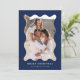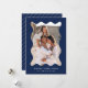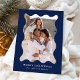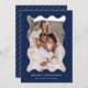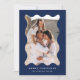 ¡Envíe saludos festivos a sus amigos y familia con esta moderna tarjeta fotográfica de vacaciones! La simple tarjeta de Navidades muestra su foto vertical enmarcada en un marco ondulado de estilo retro marino. Personalice la tarjeta de vacaciones mínima con un saludo personalizado (que se muestra como Feliz Navidad) y su apellido con letras blancas. La tarjeta se invierte para mostrar un patrón de banda diagonal blanca y marina.
