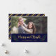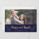 Tarjeta fotográfica navideña con las palabras "Merry y Bright" en un guión elegante en oro falso rodeado de hojas y bayas festivas con un fondo azul. La tarjeta incluye una parte posterior de franjas azules y falsas de oro. Consulta otros artículos de vacaciones aquí https://www.zazzle.com/collections/holiday_christmas_new_year_cards-119015800351034065?rf=238364477188679314 Personalízalo reemplazando el texto del marcador de posición y reemplaza la foto de ejemplo/marcador de posición con tu propia foto. Para obtener más opciones, como cambiar el tipo de letra y su tamaño, haga clic en el botón "Personalizar". *Tenga en cuenta que la marca de agua Zazzle que aparece en la vista previa del zoom NO aparecerá en el producto impreso final. © Rosewood y Citrus