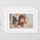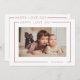 Una delgada frontera roja con Feliz Día del Amor en Relieve metalizado alrededor de una foto de paisaje. En la parte trasera de la tarjeta hay dos lugares de fotos adicionales y un texto de saludo.