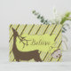 La tarjeta de Navidad de invitaciones navideñas Deer and Diagonal Stripes presenta un fondo de oliva clara, rayas diagonales grises y marrones, una campana de jingle de época, ciervo de silueta marrón, pancarta de olivo y texto que dice ¡Creer! En la parte posterior hay un ciervo de silueta marrón en gris con un área donde puede agregar su mensaje de texto y sus nombres. Tenemos franqueo, pegatinas, etiquetas de dirección de retorno y sobres coincidentes.