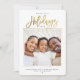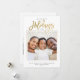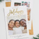 Minimalista tarjeta de vacaciones de fotografía familiar en un diseño moderno de escritura tipografía leyendo FESTIVOS MÁS FELICES con tu mensaje personalizado y tu foto favorita enmarcada con un esquema de oro impreso. Trae alegría a tus seres queridos con esta adorable, simple, moderna y sobria papelería. En la parte posterior se muestra un collage de fotos múltiple.