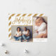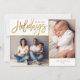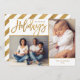 Personalizado económico imprimió tarjetas fotográficas de vacaciones con plantillas sencillas para la personalización. Este elegante diseño neutro cuenta con un falso borde de Relieve metalizado dorado alrededor de un diseño de 2 collage de fotos. El texto del guión moderno de caligrafía dice las vacaciones más felices. Personalízalo con tus fotos, tu apellido, el año u otro texto personalizado. Tenga en cuenta que el Relieve metalizado de oro falso es parte del diseño impreso - las tarjetas no tendrán Relieve metalizado metálico real. El lado inverso tiene un patrón falso de franja de Relieve metalizado o usa el espacio para fotos y texto adicionales. Utilice las herramientas de diseño para cambiar los tipos de letra y los colores del texto, añadir más fotos y crear una única de un diseño de tarjeta fotográfica de vacaciones.